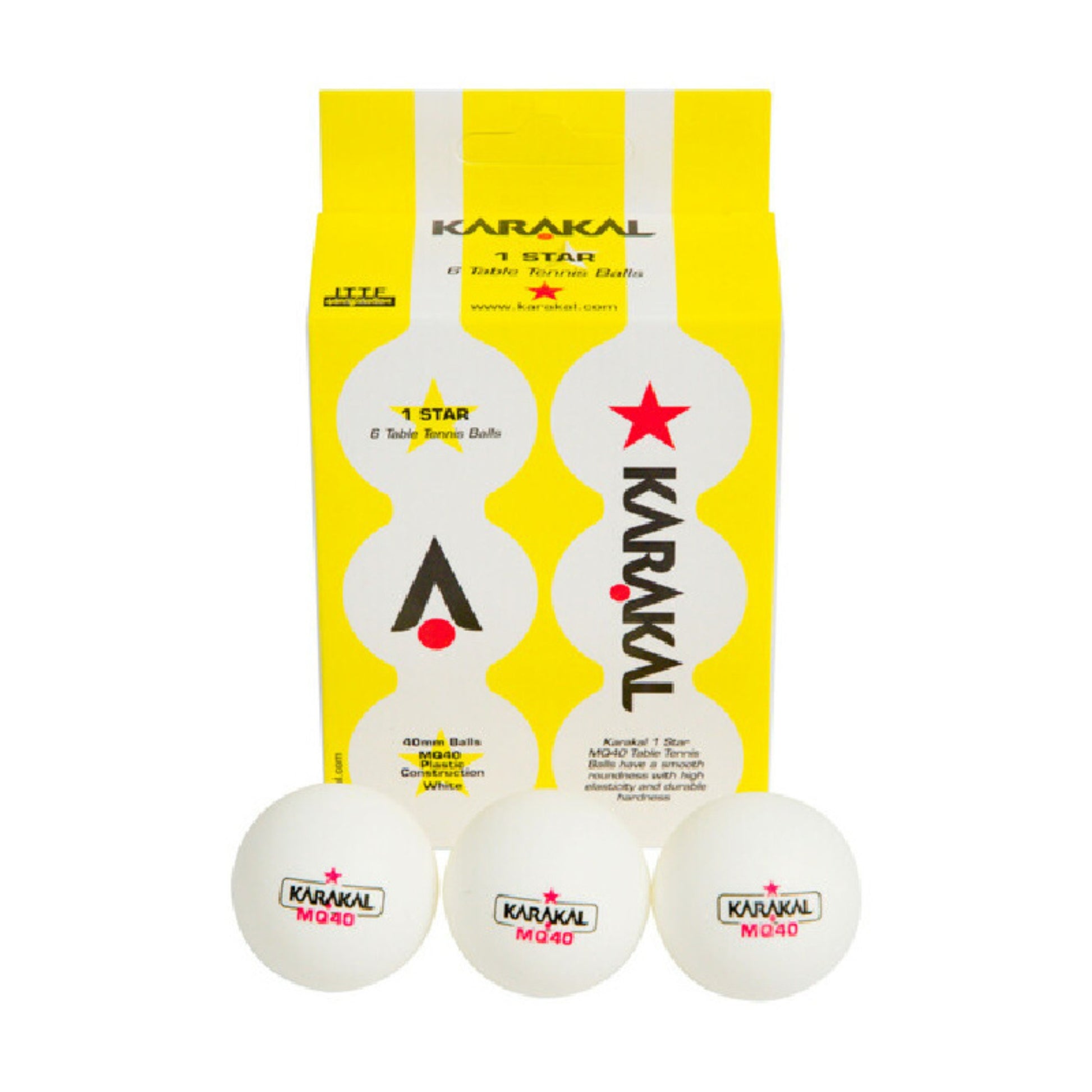New to the Karakal Table Tennis range are our 1 Star MQ40 Table Tennis balls. Available as a box of 6 balls and made to ITTF specifications, this 40mm poly ball has a smooth roundness with high elasticity and durable hardness for a consistent bounce.