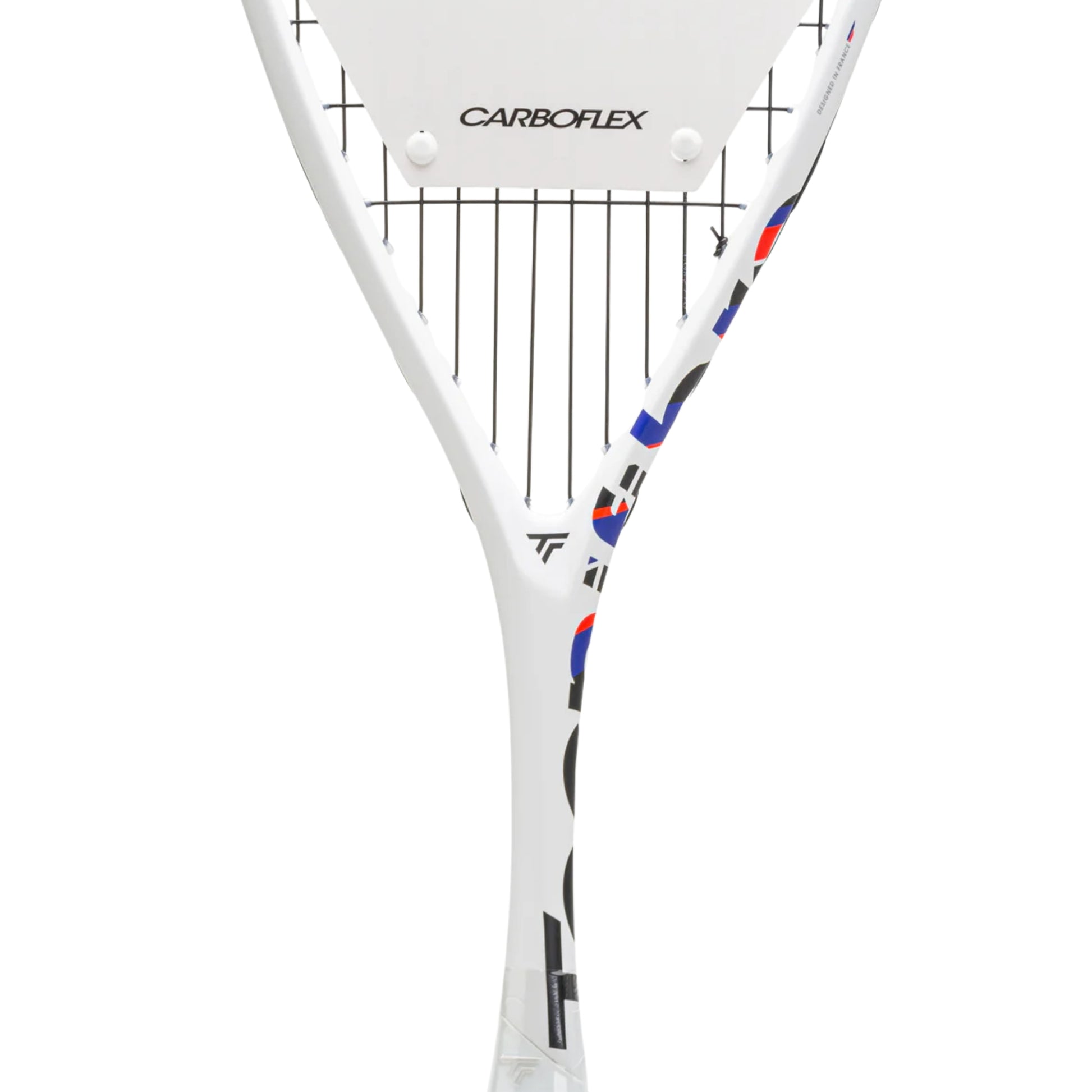 The CARBOFLEX 130 X-TOP V2 squash racket has been designed to maximize each player's swing speed . Ideal for high-level competitors and regular players, it stands out for its power. Thanks to JUMBO SHAFT technology, this reinforced monoshaft racket generates power directly from its structure. With a 500 cm² head size, it offers a perfect compromise between power and stability. Its Dynamix VP string, a polyurethane multifilament, is the most responsive of the Tecnifibre brand, providing more sensations and responsiveness to players looking for maximum power. The CARBOFLEX X-TOP V2 range pushes the boundaries of innovation with its patented X-TOP technology. The bumper, usually made of plastic, has been removed and replaced with a blend of active fibers, which increases the strength, speed, and playability of the racket. Aramid fibers, known for their exceptional impact resistance, and a PTFE treatment have been integrated to improve glide and protect the frame from abrasion. In the absence of a bumper, the racket is more aerodynamic, which allows better penetration in the air, thus maximizing swing speed and power. Replacing the plastic with this new material allows for more fibers to be added, reducing vibrations and providing more comfort during use. The racket design has been optimized by the Airshaft section, which improves aerodynamics to promote better acceleration. The monoshaft structure is reinforced by X-Arms tendons on both sides, which limit the flex of the racket and improves stability and precision during impacts. For better tolerance on off-center hits and better spin control, the CARBOFLEX 130 X-TOP V2 racket incorporates Extended String Holes technology: 12 strategically placed grommets (at 3 o'clock, 9 o'clock, and 12 o'clock) allow for better string elasticity, thus providing more tolerance on off-center hits. Used on Tour by squash legends such as Mohamed el Shorbagy , Nour el Sherbini , Nouran Gohar and many others, the CARBOFLEX X-TOP V2 range benefits from the support and active participation of these champions in its development and technical evolutions.